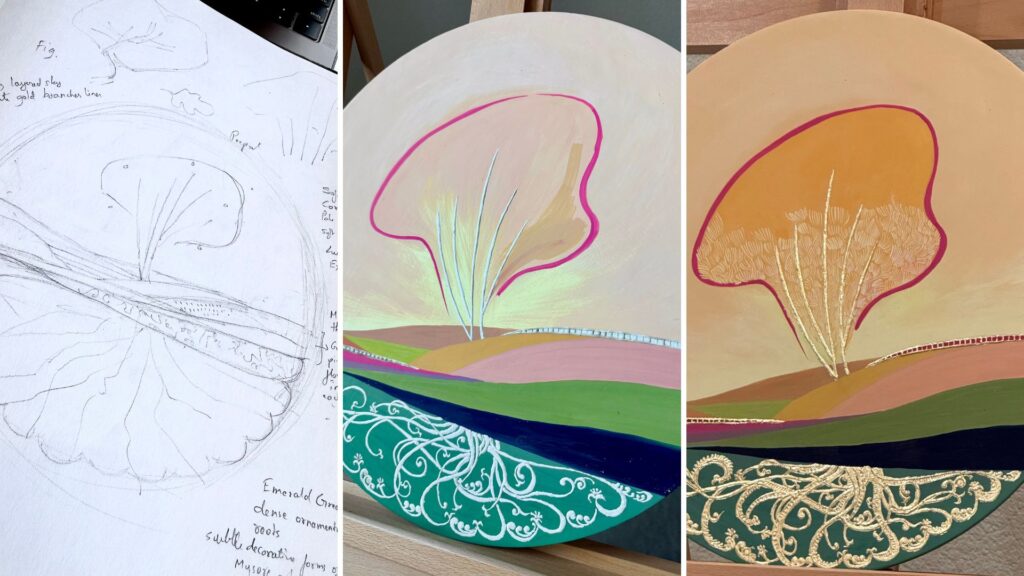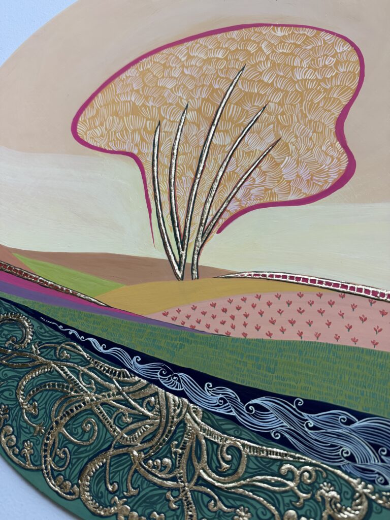 In this piece, I chose to work with a circular composition, something that feels whole, continuous, and cyclical. Within it, a contemporary landscape unfolds: open skies, soft hues of pink and yellow, and a solitary tree rising upward. This upper world is expansive. It breathes.